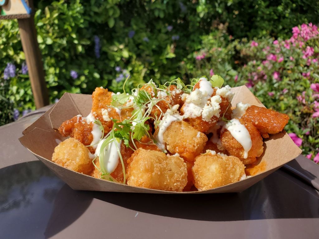 This is the very first item I tried at the festival! While I enjoyed it, I don’t think I would get it again. This is one of the more expensive options I tried and I’m not sure if I felt like it was worth the price. It is also a Garden Graze item on the festival passport. Instead of fries, this has tater tots, or Potato Barrels as Disney calls them. The potato barrels were cooked perfectly and I really enjoyed them. The plant based chicken tenders where a nice size and tasted like a standard vegan chicken tender. They were good, but not really anything special. The buffalo sauce was not spicy at all to me but I think that depends on your tolerance. I saw reviews saying they were spicy and the woman behind me said they “had a kick”. My mom also agreed to that and wouldn’t eat pieces with too much sauce on it. The buffalo sauce had a vinegar taste that I was not expecting but was good. I have had plant based ranch at Disney before and I always really enjoy it, so it was a nice addition to this item. Originally, I was going to order this without the blue cheese crumbles because I do not like blue cheese. I decided to keep it on to try this poutine as is because I also didn’t think it would actually taste like blue cheese. I ended up picking off all the crumbles because they tasted too real to me.