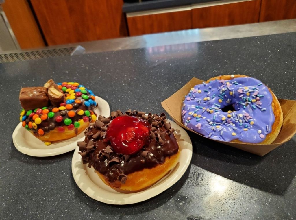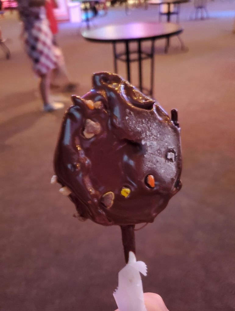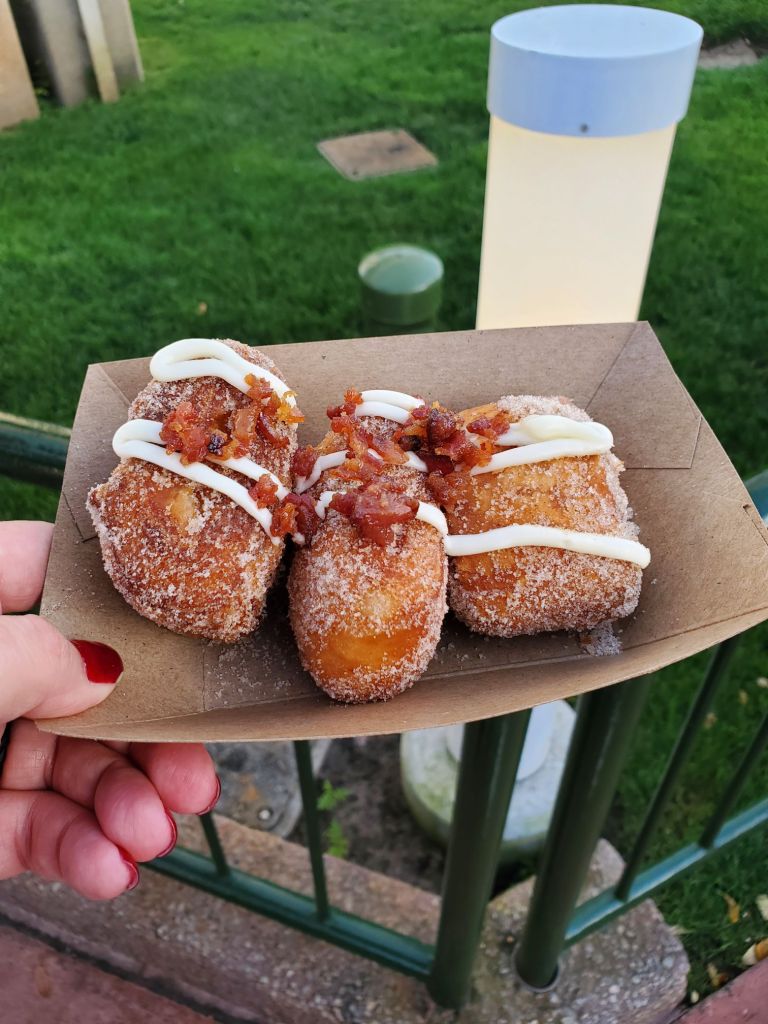 This was on my list to try last year, but unfortunately was not able to. The Fried Cinnamon Roll Bites from last year apparently had a filling which was missing from this year’s. Instead of the filling, these just have a cream cheese frosting. For many years, one of my favorite snacks at Disney was cronuts. I have tried different variations of them and loved all of them. The Fried Cinnamon Roll Bites have been the closest thing I have found to a cronut in so long. The bites were the perfect combination of a flaky outside and an airy and moist inside. The cinnamon sugar it was dipped in had so much flavor, and the cream cheese frosting was sweet but didn’t taste too overpowering. My mom loved the candied bacon and thought it complemented everything perfectly. This was definitely one of my favorites from the festival, and I highly recommend trying it!