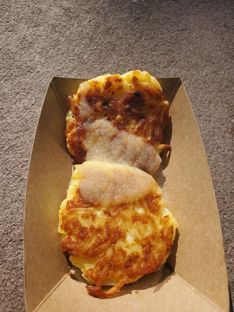 This is one of my favorite festival snacks but I always forget to list it because there seems to be a variation of it for every festival. The outside of the potato pancakes are so crispy! The inside is so perfect; moist and nicely seasoned. I think what makes these so great is that the potatoes are shredded, so they have an amazing texture and the pancakes don’t come out mushy. I also really enjoy the apple sauce because it is sweet but isn’t too sweet and doesn’t overpower the other flavors.
