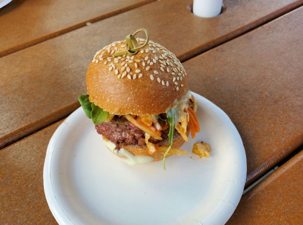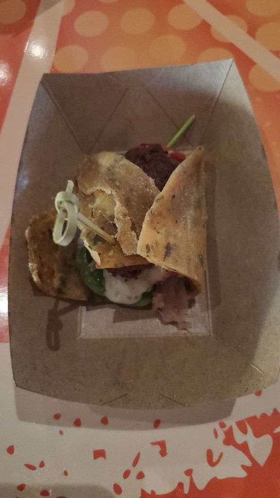 I had a similar dish to this in 2019 and was so excited to have it again! Based on other recent reviews, some people felt that the bread was dry and that the meatballs were spicy and had a curry flavor. Unlike in 2019, the lentil bread did break apart a lot and made it difficult to eat, but I wouldn’t say it was dry. I also thought everything was perfectly balanced and all the flavors tasted amazing together. This was one of my top snacks from the festival and I highly recommend it!