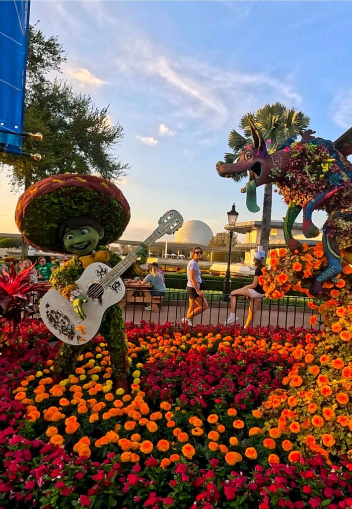 1) Top 5 topiaries – This year, they have more beautiful topiaries than ever before. New this year is a Coco topiary outside of the Mexico pavilion, It is truly stunning and I love all of the marigolds. I also loved the Encanto themed topiary. It is a repeat from last year and is located in the World Showcase Plaza. My other favorites include the Bambi themed topiaries near the lagoon near the UK pavilion and the Figment topiary in the new section of World Celebration. I also loved the Mickey, Minnie, Pluto, Chip, and Dale topiaries near the bridge to the World Showcase.