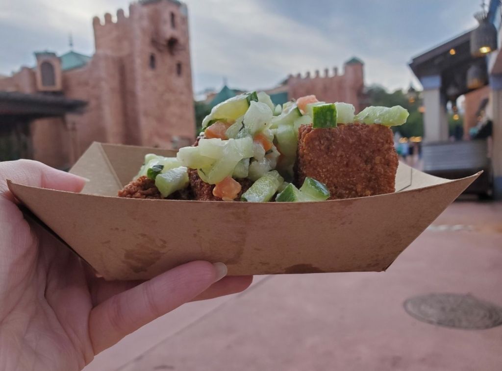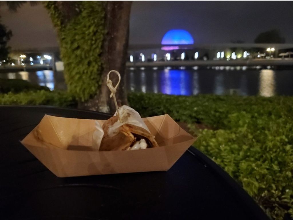 This was my absolute favorite item from the festival. My only complaint would be that this felt more like an empanada than a Jamaican beef patty. I love empanadas though so this definitely worked out for me! The papaya syrup was sweet but still had kick to it. The pastry was crispy and cooked perfectly. The filling had more of a meatball texture than ground beef. It was spicy and seasoned amazingly. I don’t have my mom’s review for this item because I knew it would be too spicy for her. I usually don’t find Disney food spicy, but this definitely had a kick to it. It was the perfect level for me but I would probably skip this item if you are sensitive to spice!