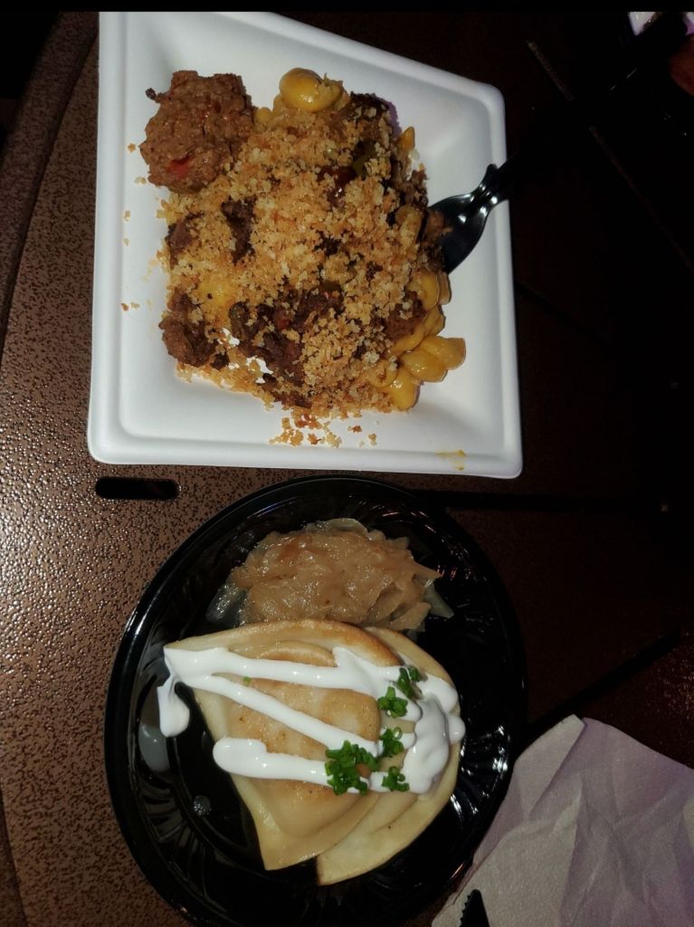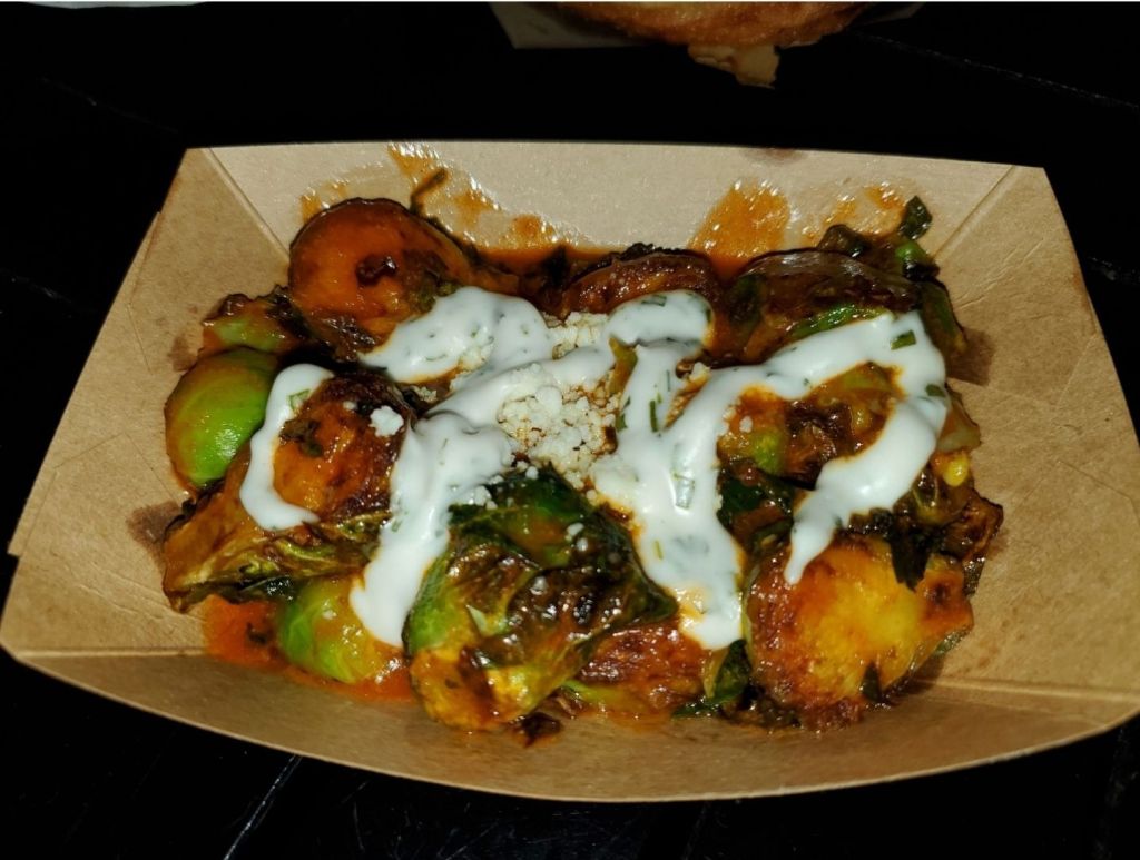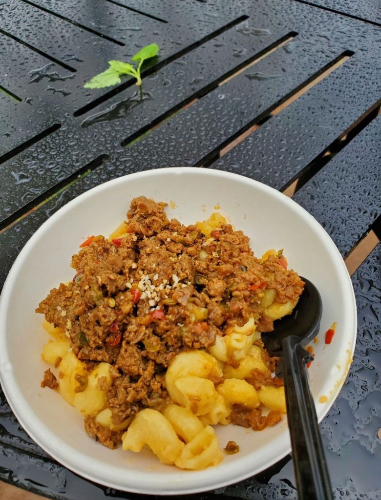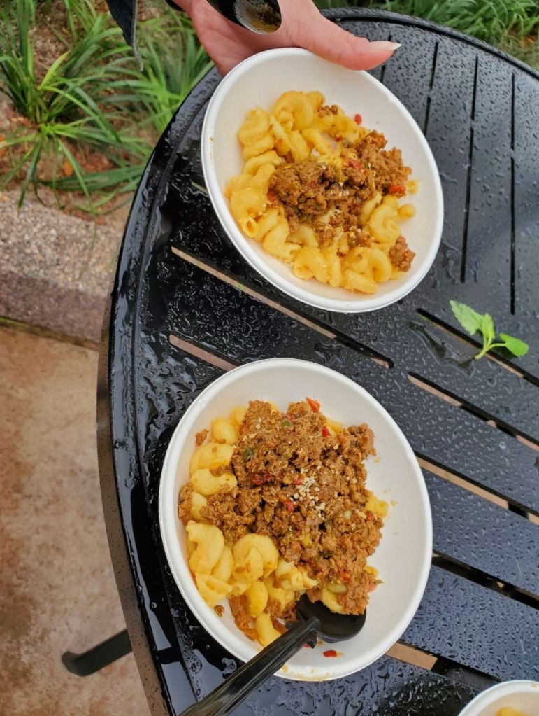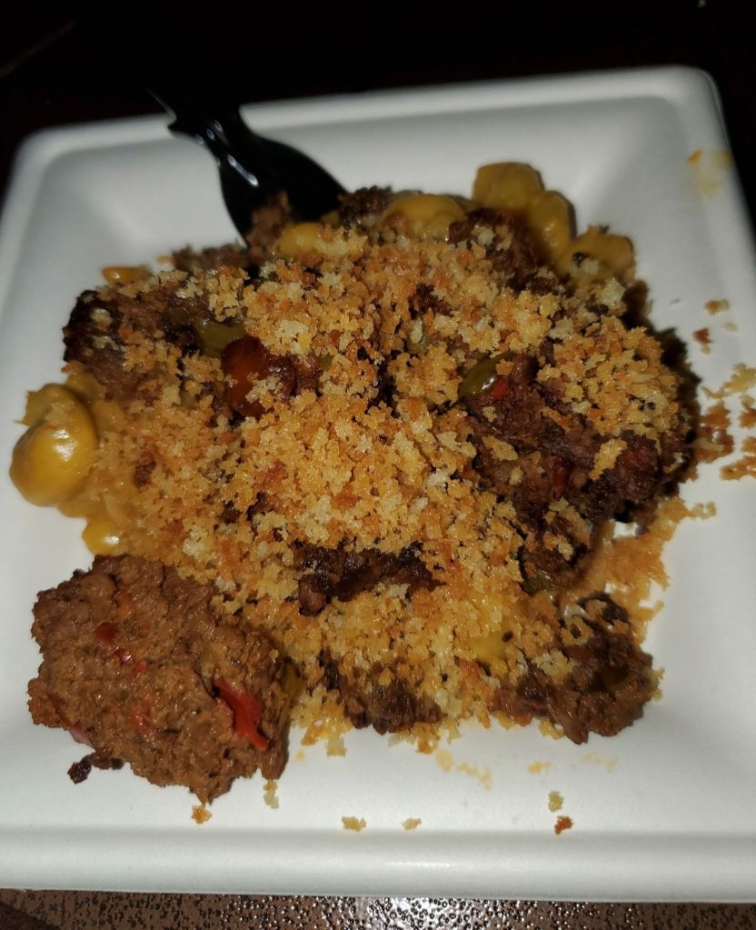 This was probably the item I was most excited to try. While it is vegetarian, it does contain dairy so it is not completely plant based. The sausage gravy and chicken fried steak are both made by Impossible Foods. Based on reviews I saw leading up to my trip, this item seemed pretty hit or miss. I personally lucked out, but I did see other pictures/videos where the dish looked completely different. For me, the biscuit was thin and had a buttery, moist flavor. It was not dry at all and was the perfect size compared to the amount of gravy and plant based chicken fried steak. The sausage gravy was absolutely amazing and is something I am still trying to recreate at home. The chicken fried steak was a pretty standard impossible burger to me, however it was really salty. That was the only flavor I could really taste from it, which was disappointing because I really feel like they could have made this amazing. I loved the green onions on top because they added a nice freshness that took away some of the saltiness. This was surprisingly one of my mom’s favorites from the festival and she ended up finishing mine. I think this also would have been my favorite if it weren’t for how salty it tasted.